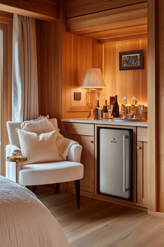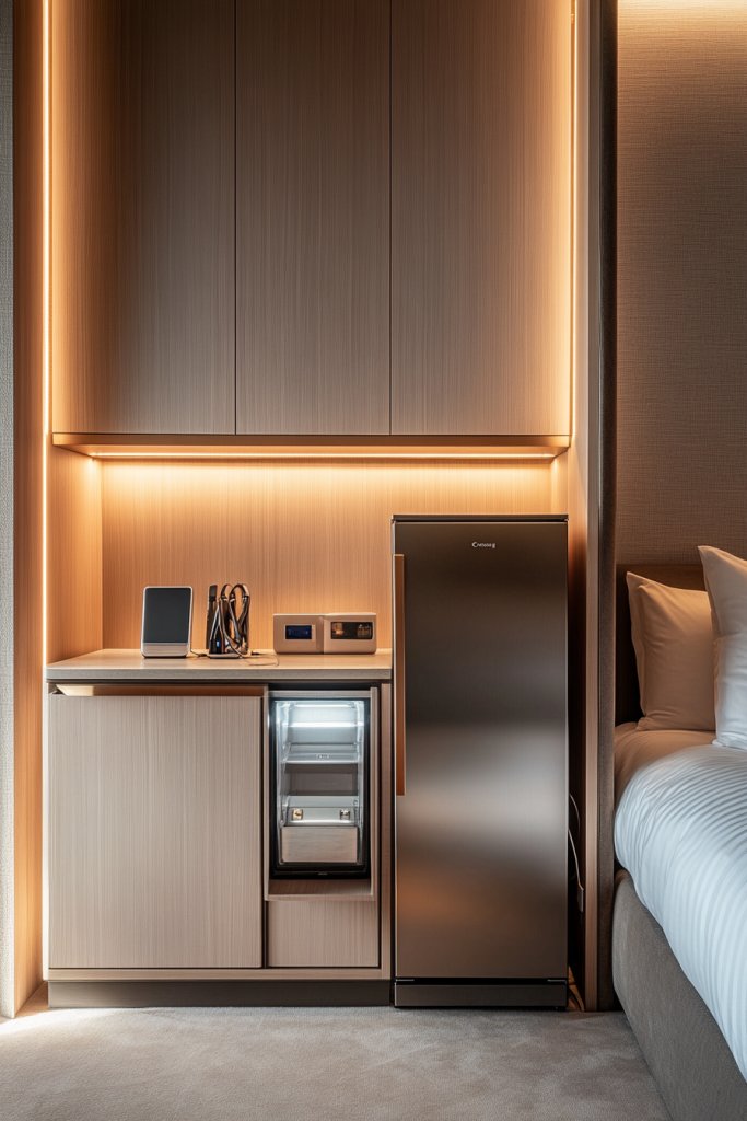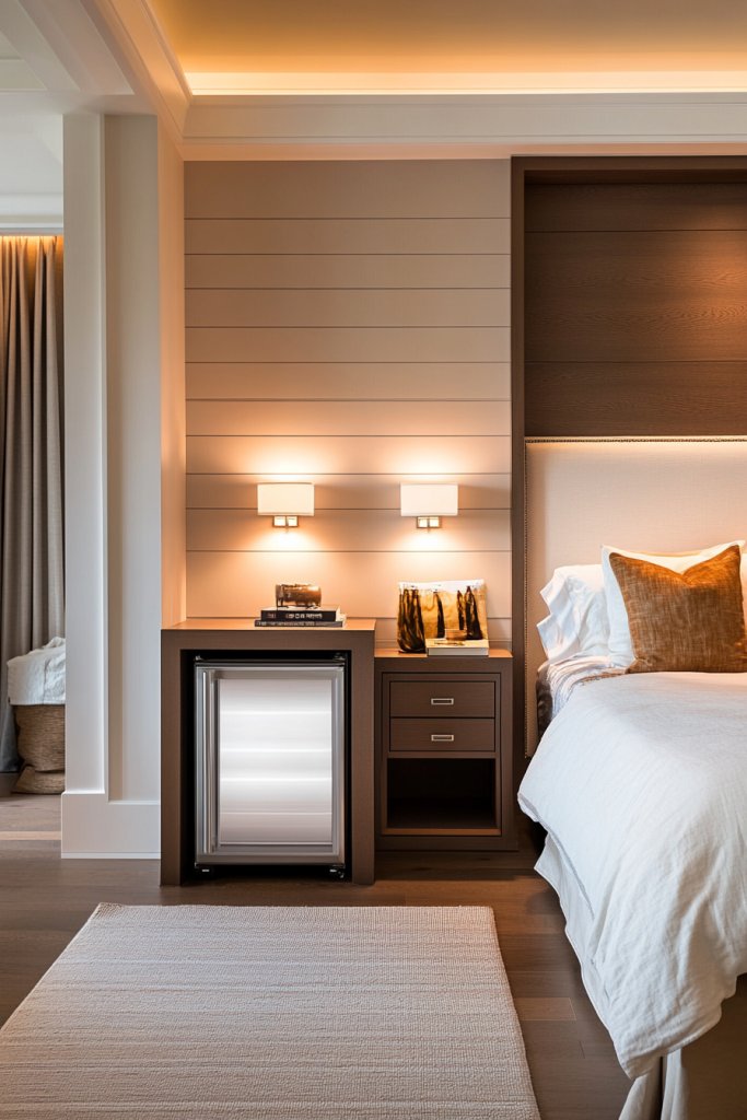 A recessed mini fridge with customized wall paneling creates a sleek, integrated look that feels high-end and practical. It’s perfect for modern or minimalist spaces aiming for a seamless aesthetic. Seeing how this transforms your room will inspire more architectural details and clever built-ins. Practicality meets design excellence—your space deserves it!