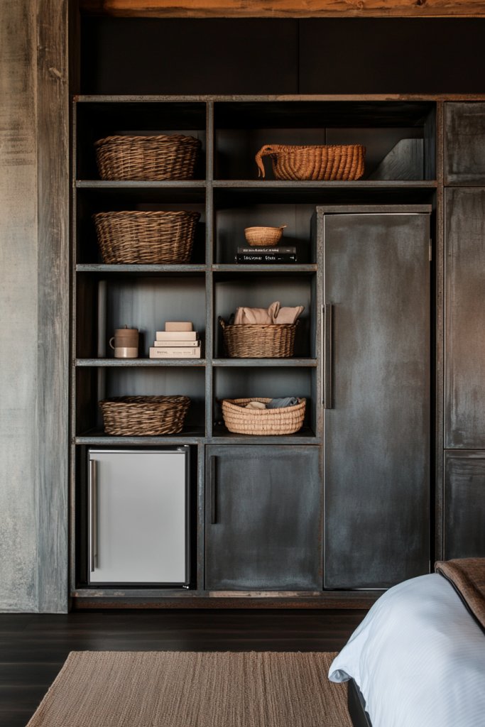 Tired of boring, plastic-looking mini fridges? An industrial-style metal cabinet with open storage adds edge and functionality to your bedroom. It offers a rugged, stylish alternative that keeps essentials close at hand. Who says utility can’t be bold?