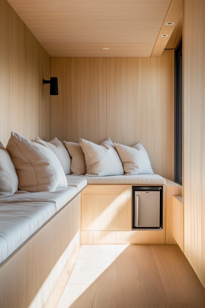 Looking for a cozy yet functional way to optimize space? A Scandinavian-modern built-in bench with hidden fridge storage offers a sleek solution. It combines seating, storage, and style in one clean package. Who says your furniture can’t do more?