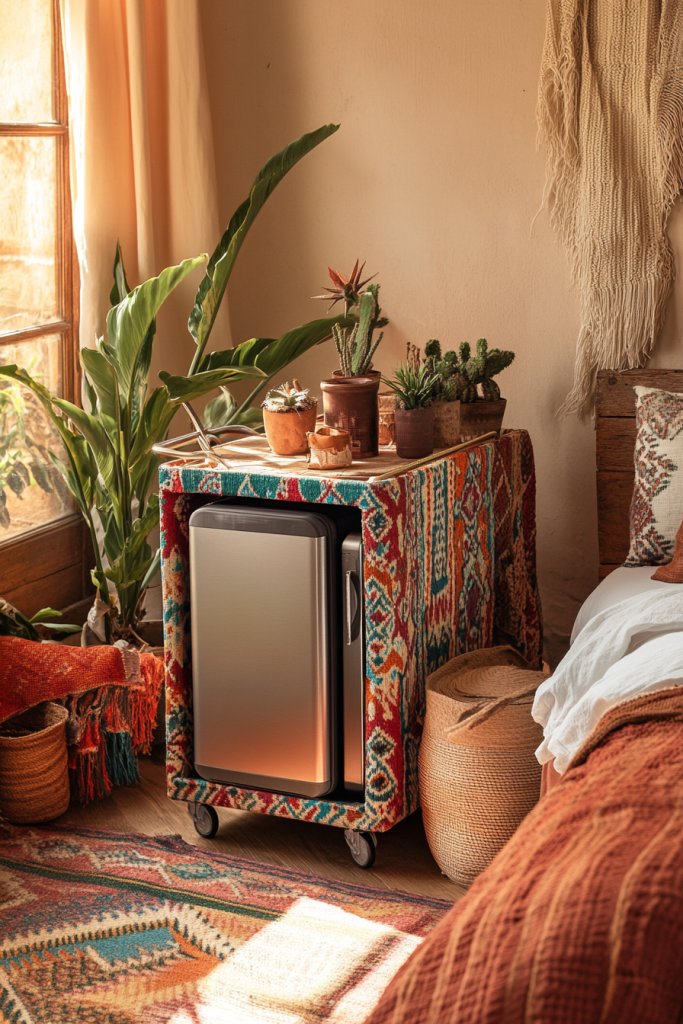 Craving a flexible, stylish way to keep your essentials close? A boho-chic cart or trolley with a mini fridge compartment offers mobility and personality. It’s perfect for those who love to move their space around or add a touch of free-spirited charm. Who says practicality can’t be fun?