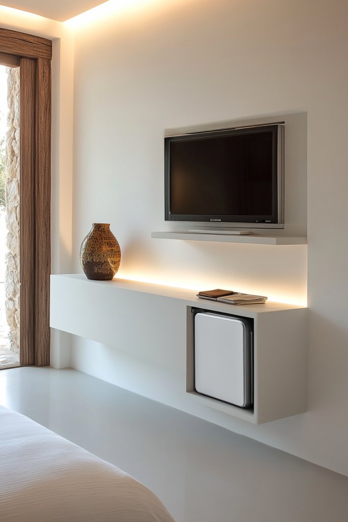 Is your bedroom cluttered with bulky furniture? A floating shelf with a hidden mini fridge compartment offers a sleek, minimalist solution. It keeps essentials close without crowding your space or disrupting your clean aesthetic. Who says practicality can’t be invisible?