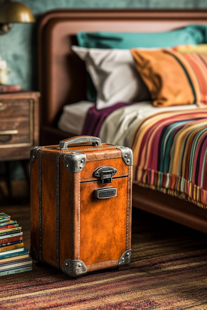 Choose a vintage suitcase in your favorite color or finish, from distressed brown leather to colorful fabric. For a more playful vibe, add patches or stickers matching your personality. This setup works well in eclectic or boho bedrooms, where mismatched or repurposed items add character. You can also add a small handle or wheels for mobility, making it easy to move around or clean.