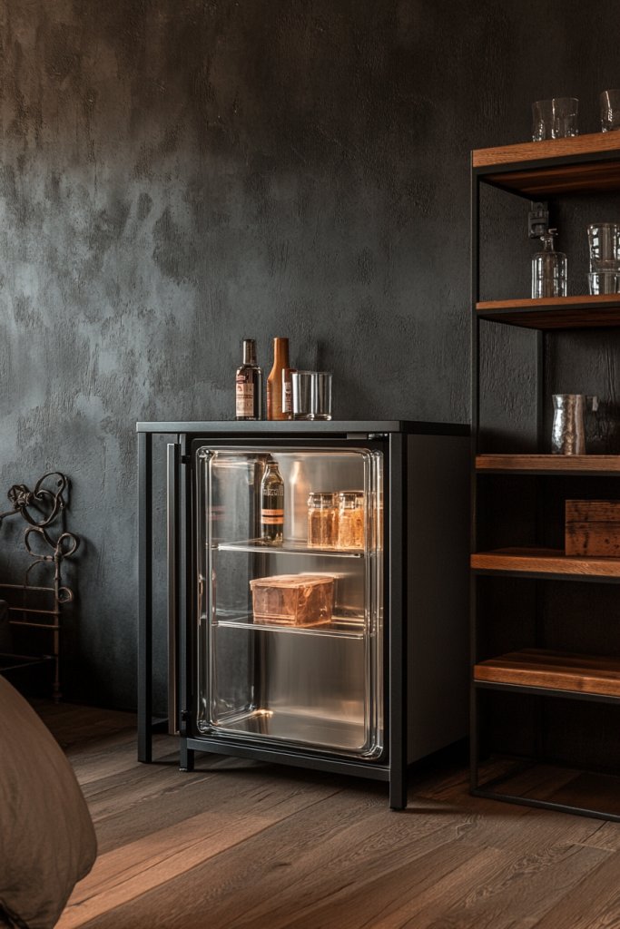 Visualize a black or brushed steel frame encasing a mini fridge with transparent glass doors. The metal structure features clean, geometric lines, and maybe even exposed bolts or rivets for added edge. Inside, the fridge’s contents are visible, adding a layer of visual interest. The entire setup balances raw industrial materials with a polished finish, creating a trendy focal point in your room.