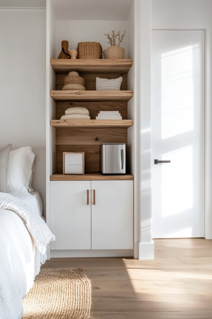Craving a bright, airy bedroom that feels spacious and organized? A Scandinavian-inspired white cabinet with open shelves offers a minimalist way to keep your mini fridge accessible and stylish. It’s a fresh, functional upgrade that emphasizes simplicity and light.