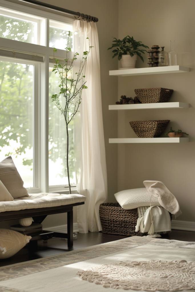 Maximizing natural light sets the perfect stage for a serene minimalist room, but it’s just as important to guarantee the space feels open and inviting by decluttering. Start by evaluating every item in your room. Ask yourself if it serves a purpose or brings you joy. If it doesn’t, it’s time to let it go. Create designated zones for essential items and use stylish storage solutions—think woven baskets or sleek boxes to maintain that clean aesthetic.