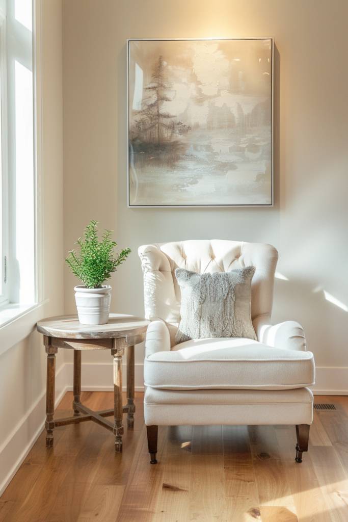 Next, consider a small side table to hold your favorite book or a steaming cup of herbal tea. Add a touch of nature with a small plant or a vase of fresh flowers, bringing a sense of calm and freshness. Soft lighting is key; a gentle lamp or fairy lights can create a warm, soothing ambiance. Finally, personalize your nook with items that inspire tranquility—perhaps a scented candle or a framed photo that brings you joy. This serene space is all about fostering peace and relaxation.