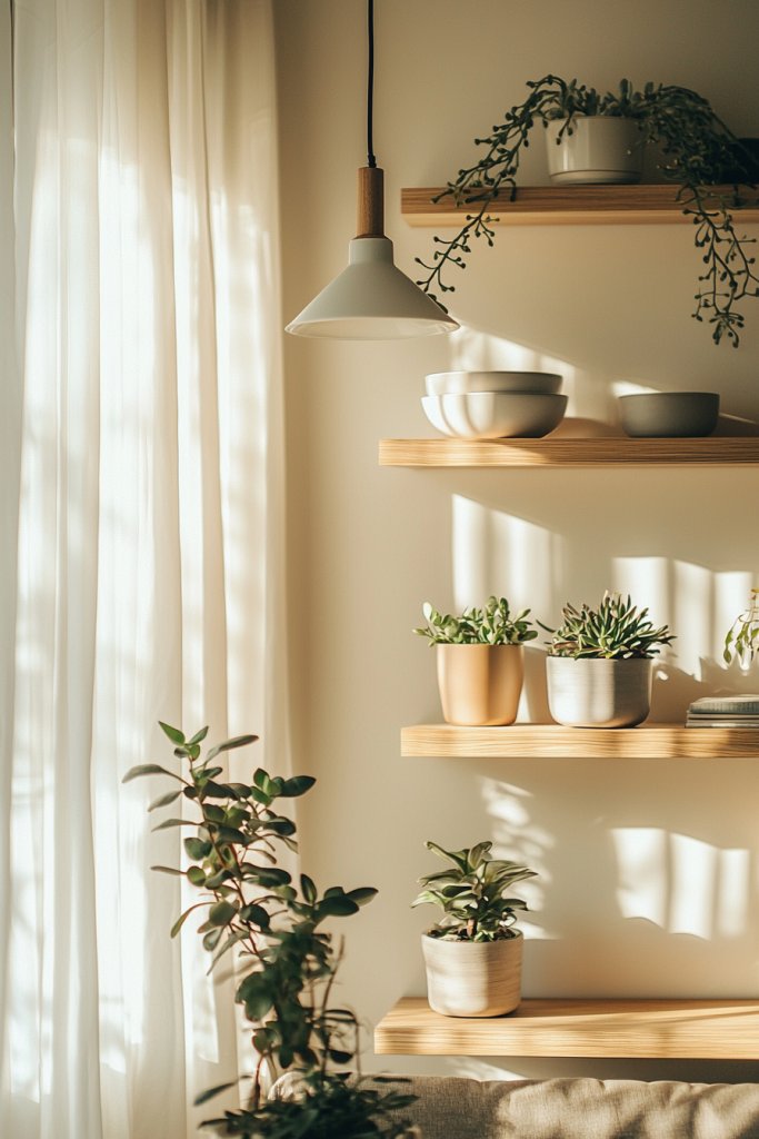 Choose materials like wood or metal to add warmth and texture, while keeping the design simple and functional. When styling your shelves, select a curated collection of items you love.