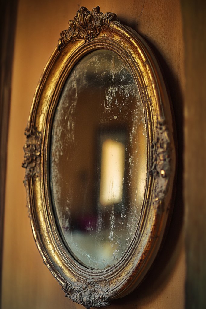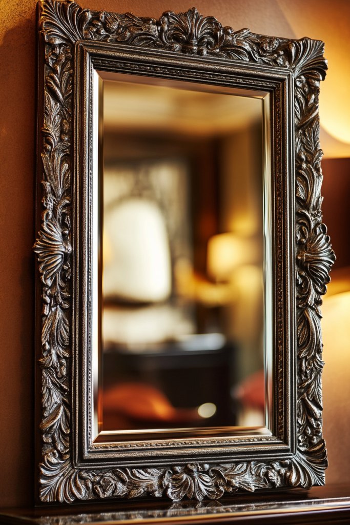 Select a mirror with a sturdy, decorative frame that matches your style. Mount it securely on the wall using appropriate hardware—especially important for heavier, ornate frames. Position it at eye level for full effect. Regularly dust and clean the frame with gentle cleaners to preserve its aged finish. Consider adding a protective coating for longevity.