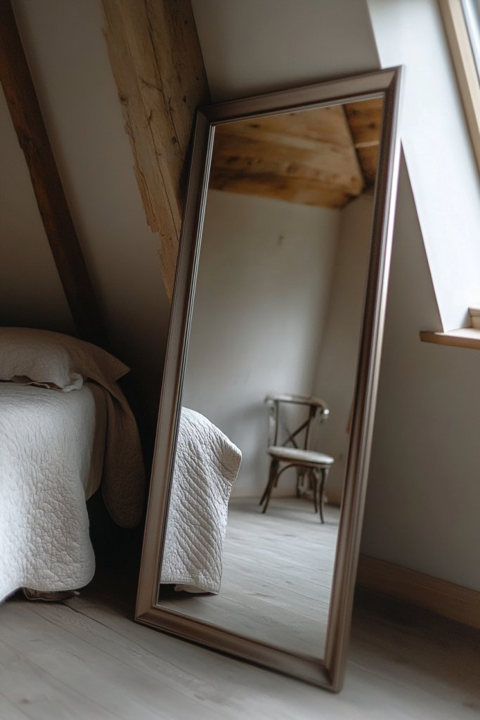 Choose a sturdy, full-length mirror with a solid frame or stand. Lean it at an angle against the wall, adjusting height and tilt for the desired look. Protect your floors with pads or rugs underneath to prevent slipping. Keep it clean with a gentle glass cleaner, and reposition as needed for different seasons or styles. This setup requires minimal effort but delivers maximum style.
