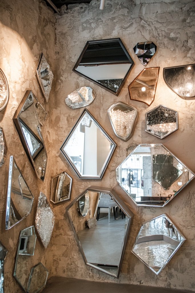 Picture a collection of differently shaped mirrors—some rectangular, others round or irregular—arranged in a seemingly spontaneous pattern. The frames range from sleek metal to ornate vintage finishes, adding layers of texture and contrast. Light bounces off these reflective surfaces, creating a shimmering mosaic that captivates anyone entering the room. The overall effect is a dynamic, artistic display that combines form and function.