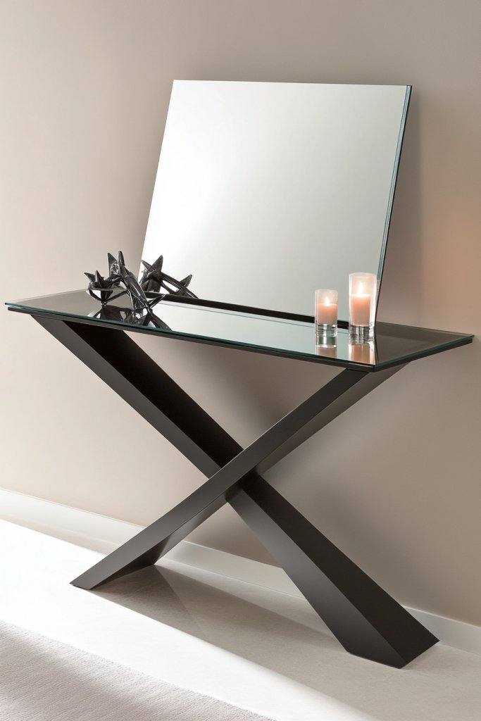 Envision a narrow table with a glossy glass or polished wooden surface, its top mirrored to reflect the surroundings. Decorate with a few decorative bowls or sculptures, and let the mirrored surface bounce light around. The reflection amplifies the room’s brightness and creates an illusion of more space. The sleek lines and reflective surface give a modern, polished vibe that’s hard to beat.
