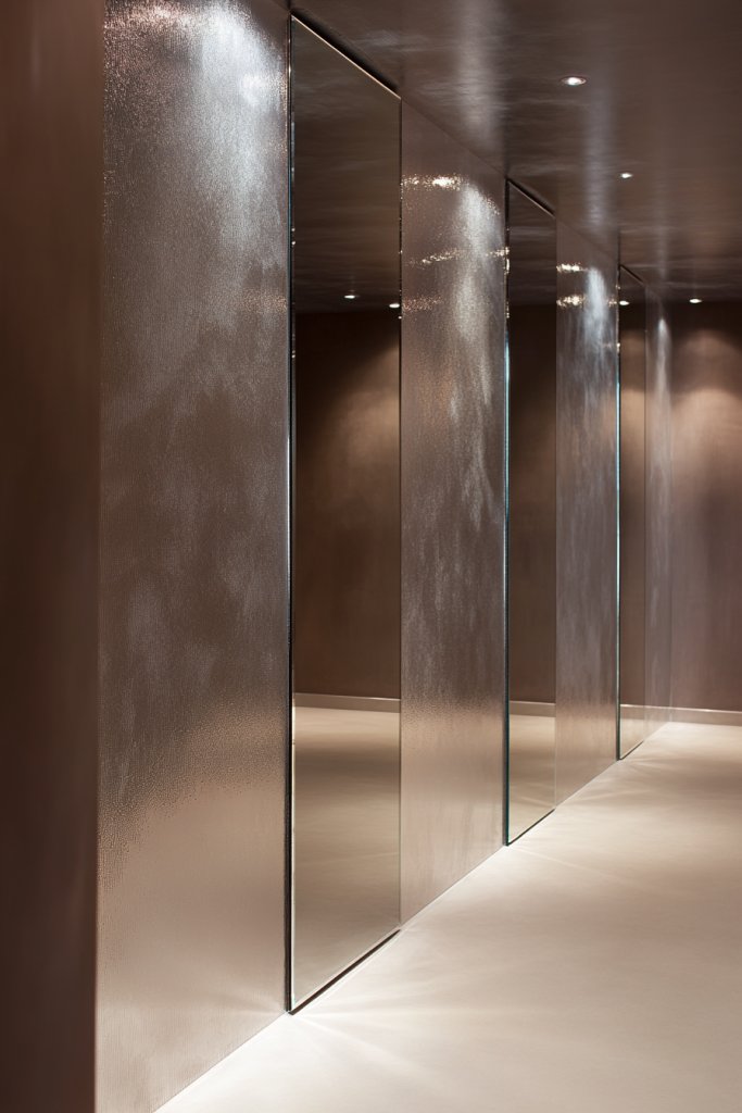 Picture large panels featuring abstract etched patterns or frosted glass with textured overlays. The designs catch and scatter light, adding a layer of visual interest without overwhelming the space. The reflective surface enhances the artwork, creating a subtle interplay of patterns and reflections. It’s like a piece of modern art that also brightens your room.