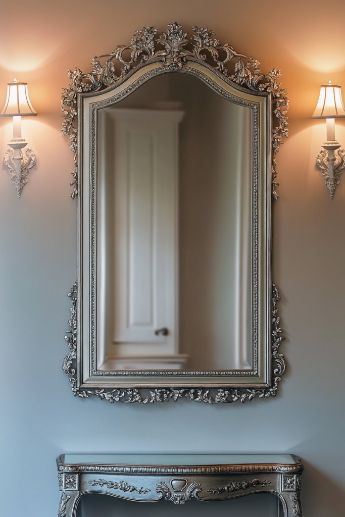 Visualize an ornate, antique-style mirror with a beveled glass edge reflecting the hustle of your morning routine. The intricate frame, perhaps gilded or distressed, adds character and a sense of history. Its classic design elevates the space, making it feel welcoming and refined. The beveled edges catch light beautifully, creating a subtle sparkle.