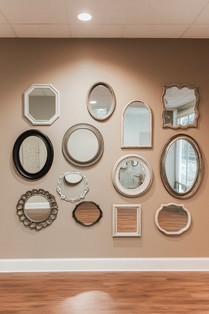 Want an eye-catching feature that combines light and reflection? Clusters of smaller mirrors paired with strategic accent lighting create a stunning visual display. It’s perfect for adding drama and personality to any space. This idea is great for those who love a gallery feel with a modern twist.