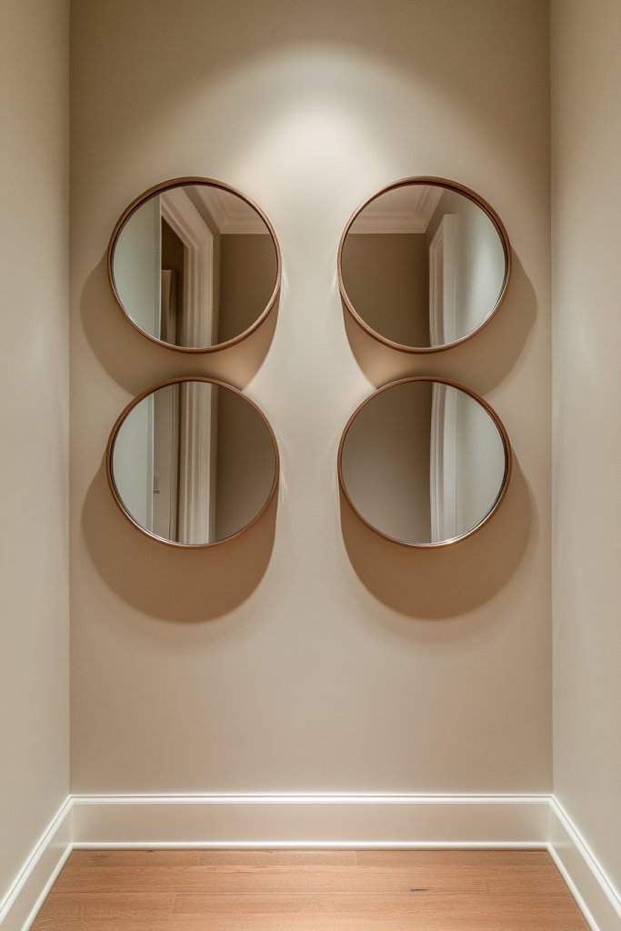Looking for a way to balance your wall decor with a clean, harmonious look? Arranging round mirrors in a symmetrical pattern creates a sense of order and calm that’s visually appealing. It’s perfect for those who want a simple yet impactful design statement. This approach combines function with aesthetic elegance.