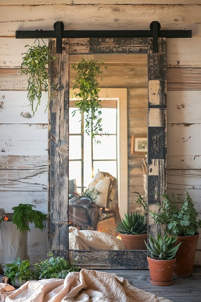 Imagine a large, weathered barn door frame encasing a sleek mirror—it’s a stunning statement piece that draws the eye and expands visual horizons. Position one in your entryway to create a welcoming atmosphere, or use it in your living room to add depth and character.