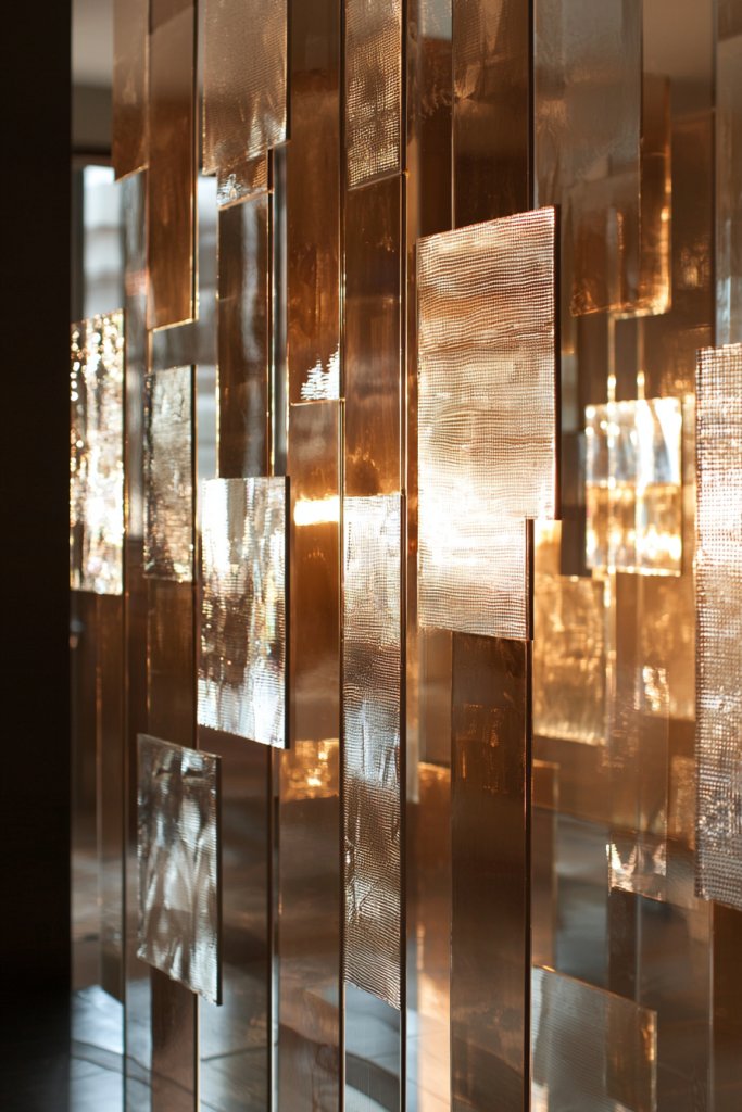 Imagine a sleek, reflective barrier that separates spaces while creating the illusion of a larger area. You’ll love how it bounces light around, brightening up even the coziest corners of your home.