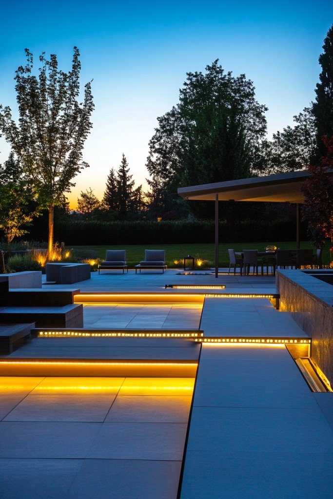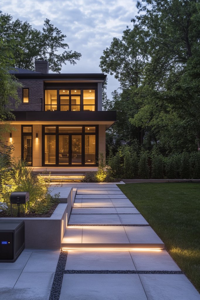 During evening, the lighting creates a cozy, inviting atmosphere, perfectly synchronized with your music. Choose from a range of fixtures—recessed, pathway, or spotlights—that match your aesthetic.