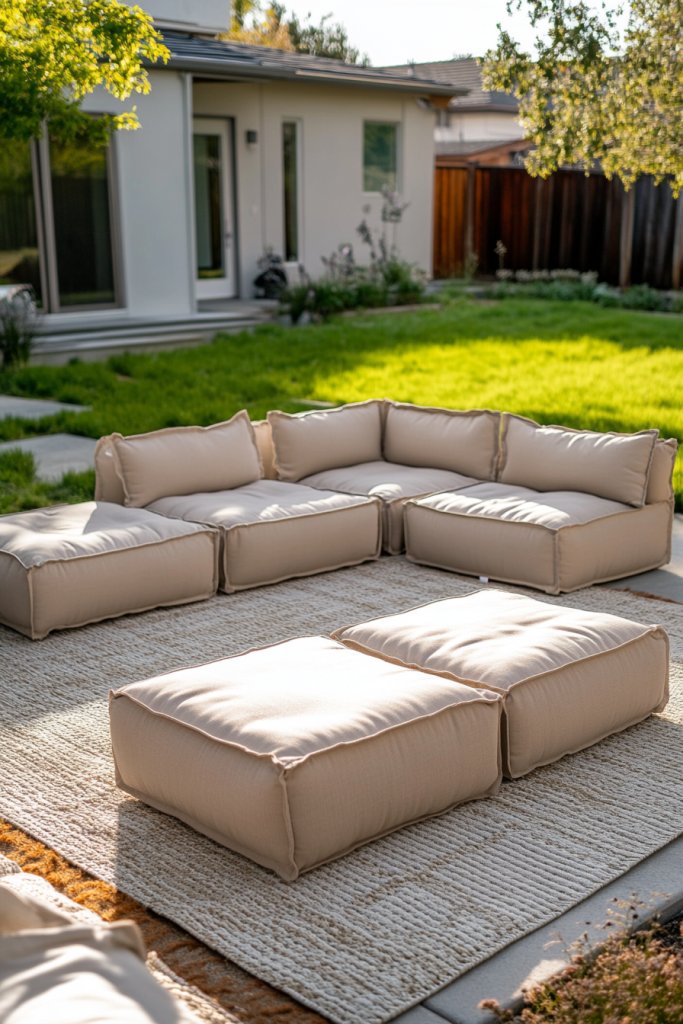 Who says outdoor living can’t be comfortable and chic? Imagine weatherproof modular sofas in neutral tones, arranged in a conversational layout on a sleek outdoor rug. The cushions are plush, with decorative pillows adding pops of color or texture.
