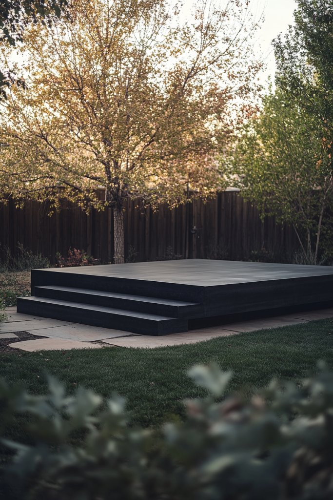Who says your outdoor space can’t be your sanctuary? Picture a simple, rectangular wooden or composite deck raised a few inches above ground level, with clean lines and smooth surface. It’s surrounded by lush greenery or minimalist stones, creating a serene boundary.