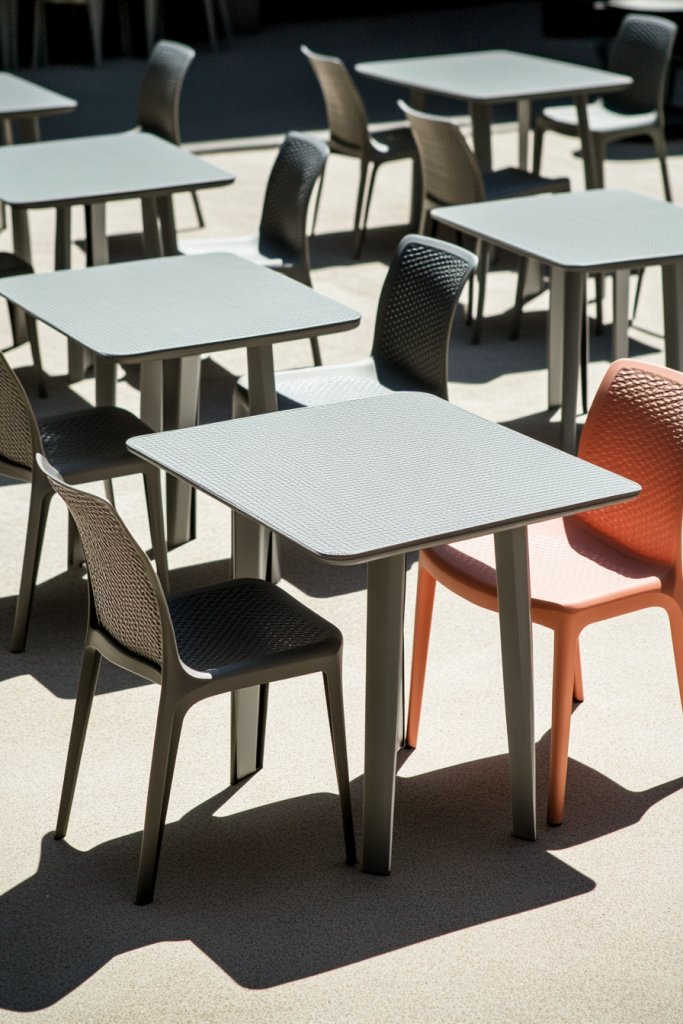 The furniture boasts clean lines and neutral tones, like charcoal or taupe, blending seamlessly with your landscape. The tabletop, made from durable composite, resists stains and weather.