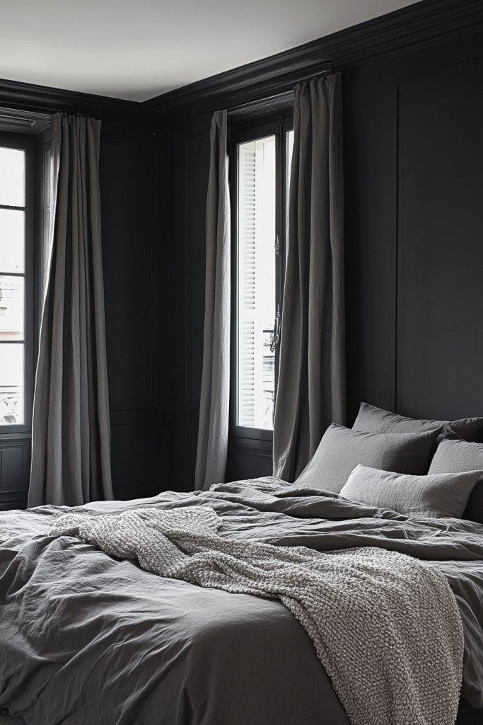 Imagine a bedroom painted in a soft, matte charcoal gray, with matching furniture that has sleek, unadorned surfaces. The textures are subtle—smooth matte finishes on the walls and furniture, contrasting gently with plush, neutral bedding. Soft indirect lighting enhances the muted tones, creating an atmosphere that’s both modern and cozy. Every element aligns to produce a seamless, uncluttered look that feels intentional and calming.