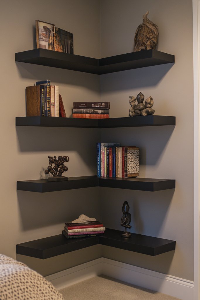 Picture a set of geometric shelves mounted on the wall, forming an asymmetrical pattern. The open design allows you to display decorative objects, books, or baskets. The shelves are in matte black or wood finishes, contrasting subtly with the wall. Items are arranged with intention—layered, balanced, and accessible—creating a curated, modern look. The open storage adds depth and visual interest without cluttering the space.
