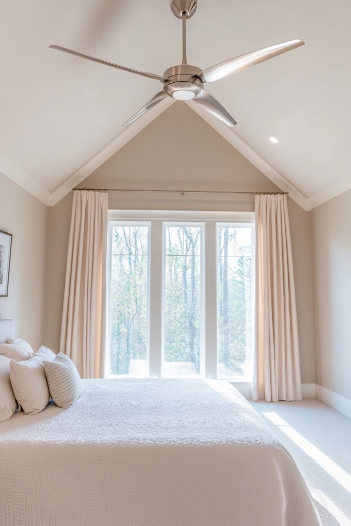 Want to keep your bedroom cool without sacrificing style? A modern ceiling fan with a slim profile and metallic finish offers a sleek solution that complements contemporary decor. It improves airflow and adds a subtle, stylish element to your ceiling. Who says functional can’t be fashionable?