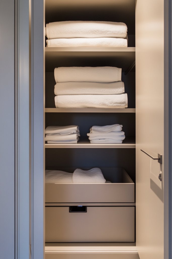 Clothes and linens scattered everywhere? A modern linen closet or wardrobe with handleless doors and organized internal compartments offers a sleek, efficient solution. It keeps everything tidy and accessible while maintaining a minimalist look. Who says storage can’t be stylish?