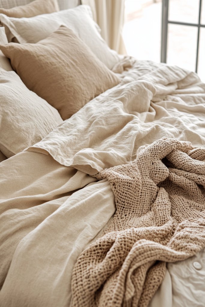 Picture a bed dressed in crisp, neutral sheets—think soft creams or muted taupes—layered with a textured duvet cover. Over this, a chunky knit throw or a woven blanket adds tactile richness. Fluffy pillows in various sizes and textures—like velvet or linen—complete the look. The overall effect is soft, inviting, and rich in subtle details that make the space feel thoughtfully curated.