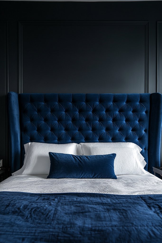 Imagine a tall, plush headboard upholstered in rich velvet in deep emerald or navy, or a sleek faux leather in matte black. It spans the width of the bed, with clean lines and subtle tufting or piping details. The texture adds depth and luxury, catching the light just enough to create visual interest. Soft bedding and minimalist nightstands complete the scene, highlighting the headboard as a true centerpiece.