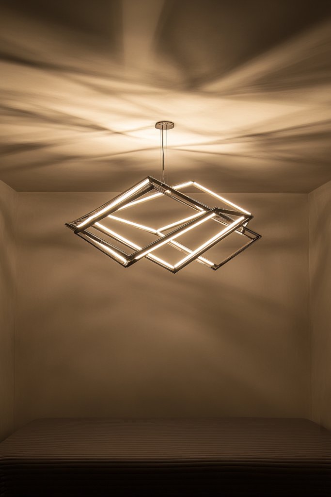 Picture a set of angular pendant lights hanging above the bedside tables, with sleek metal frames forming geometric shapes—triangles, hexagons, or abstract forms. The fixtures cast interesting shadows and diffuse light evenly across the room. The metallic finishes—matte black, brushed gold, or chrome—add a touch of sophistication. Their sharp lines contrast beautifully with soft bedding and smooth walls, creating visual dynamism.