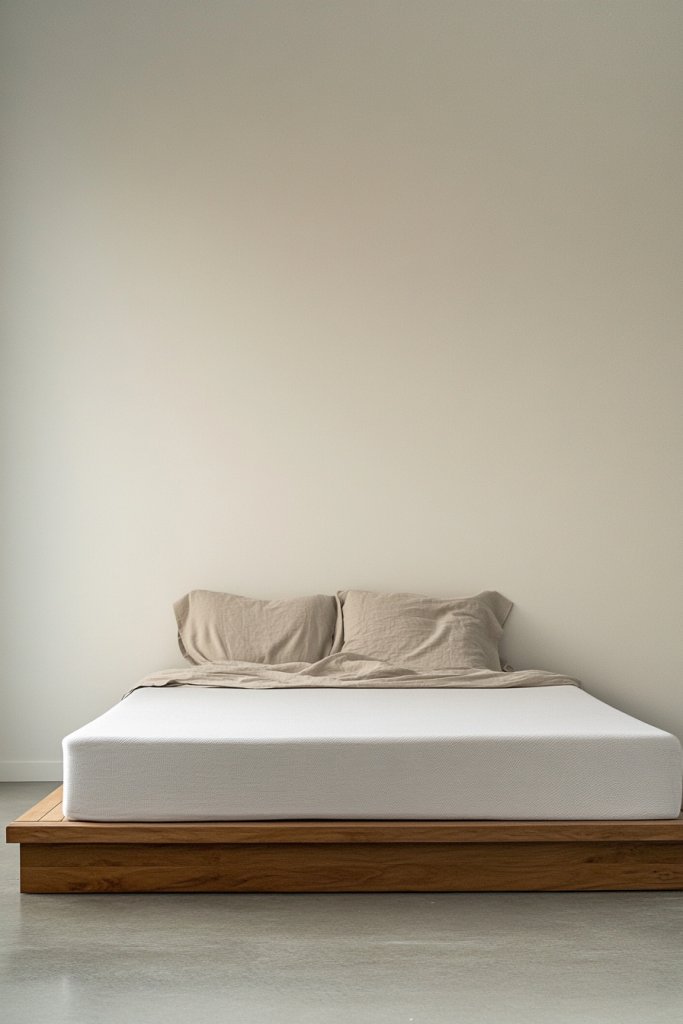 Picture a mattress sitting just above the floor or on a simple, low wooden platform with a smooth, matte finish. The design emphasizes horizontal lines and clean geometry, making the room look more spacious. Layered bedding in neutral tones enhances the minimalist vibe. The absence of a heavy headboard or bulky frame keeps the focus on simplicity and comfort.