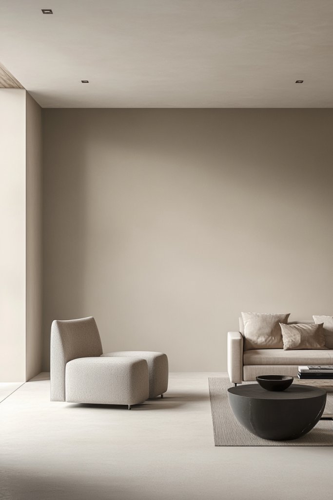 Imagine a living room painted in a muted greige, with natural wood accents and textured textiles. The soft, neutral walls reflect light beautifully, making the space feel larger and more inviting. Accents like cushions or throws in blush or pale blue add gentle pops of color. The overall vibe is calm, cozy, and contemporary—perfect for a cottage-meets-modern aesthetic.