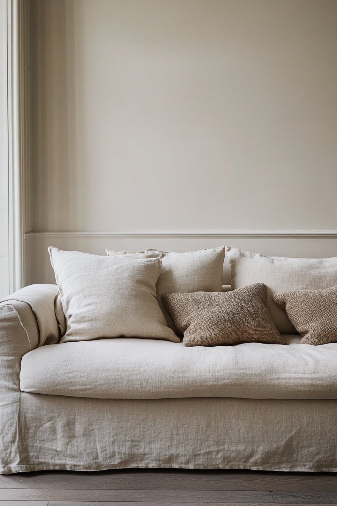 Visualize a soft, neutral linen fabric draped over a plush, deep-seated sofa frame. The slipcover fits loosely, creating inviting folds that scream comfort. The muted tones—beige, taupe, or soft gray—complement a variety of decor styles, from coastal to farmhouse. You notice how the fabric’s texture catches the light, giving the room a relaxed, effortless vibe. It’s a space that feels welcoming and lived-in.