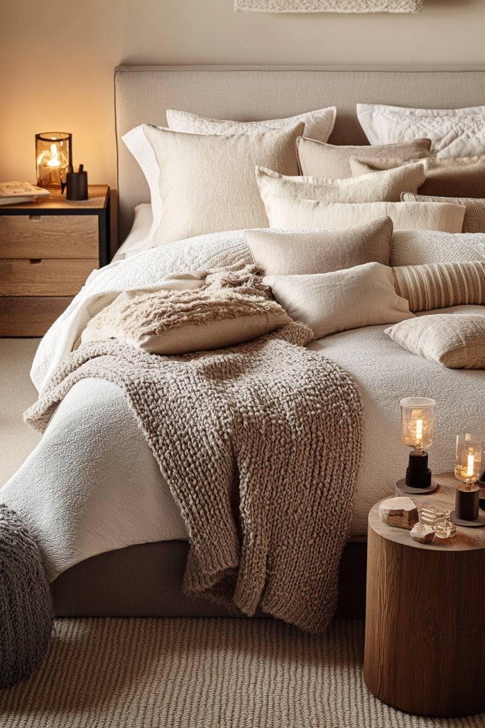 1. Layered Neutral Bedding with Textured Throws and Pillows