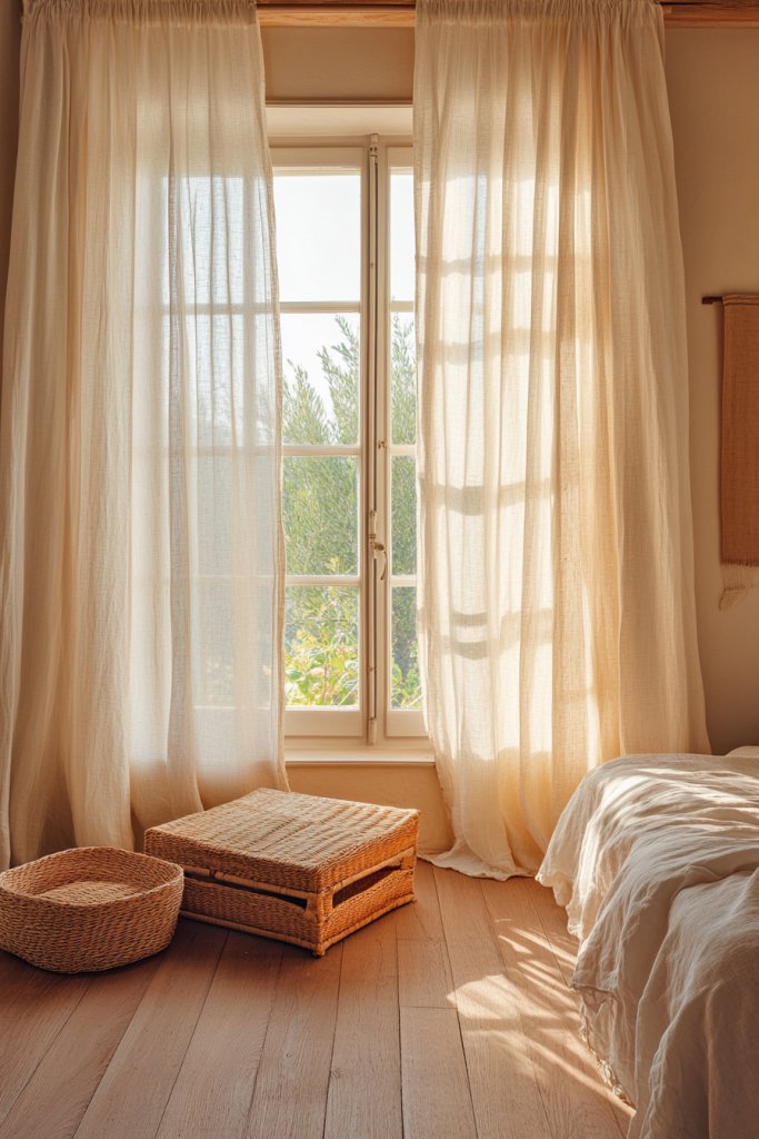 Picture flowing, light-filtering curtains in a sheer or linen fabric in shades like ivory or blush. They gently diffuse sunlight, creating a warm glow that envelops the room. When drawn, they add a layer of softness to the window frame, framing your view with a subtle, elegant touch. In the evening, they provide privacy while maintaining a calm, inviting ambiance.