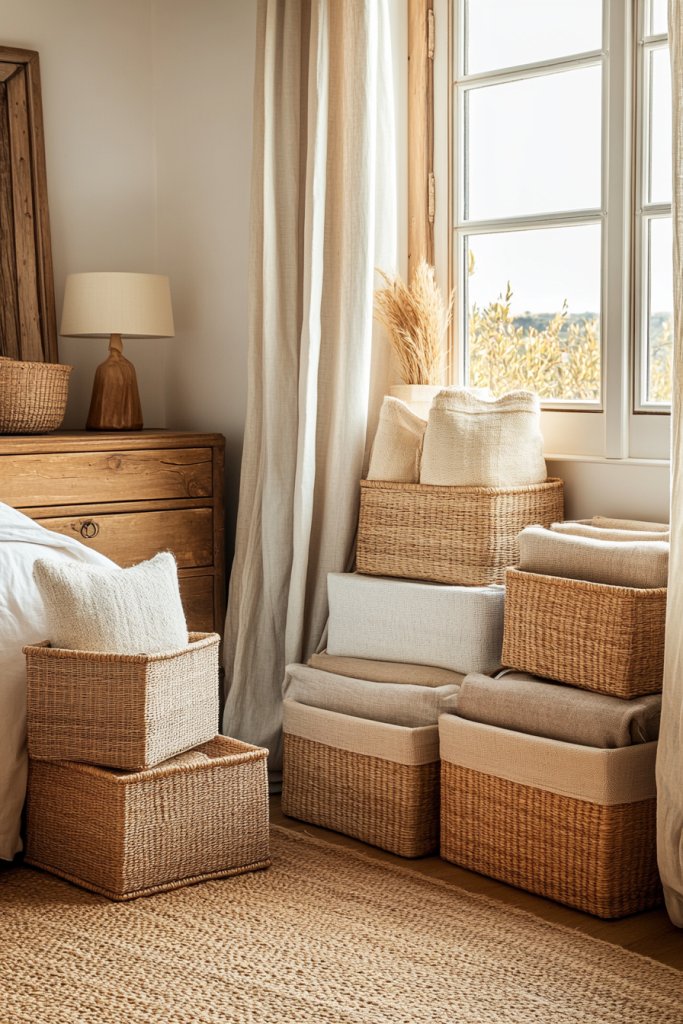 Neutral baskets and boxes make organization effortless and attractive. They show that tidy can be beautiful and simple. Once you see how well they work, you’ll want to add more across your home. A decluttered, styled bedroom is just a basket away.
