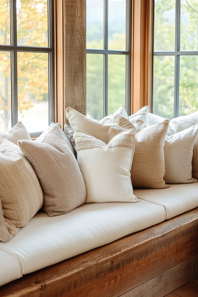 11. Layered Window Seat Cushions in Neutrals for Extra Seating