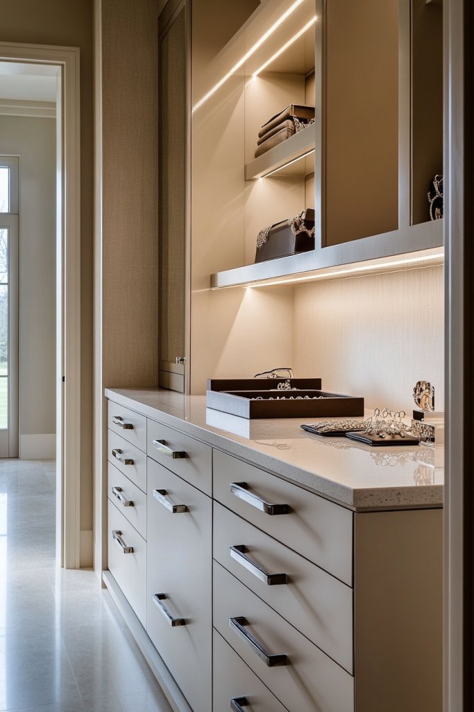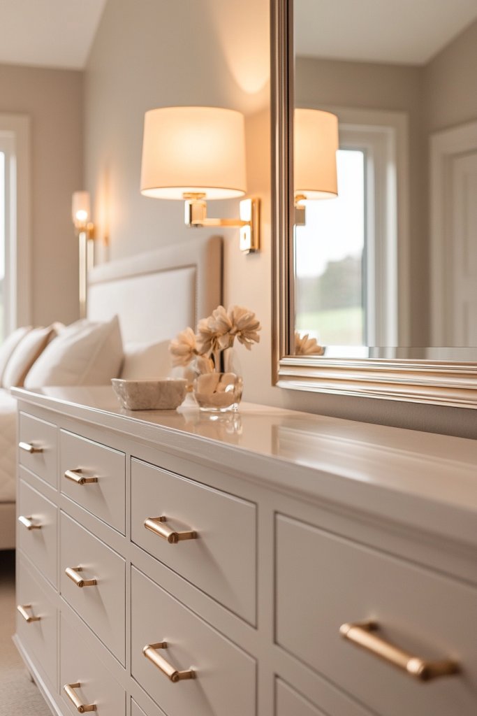 Imagine brushed brass or matte gold handles on your drawers and closet doors. Small details like these reflect light softly and create a warm glow in the room. Fixtures like drawer pulls, knobs, or even subtle corner brackets add a layer of understated luxury. The metallic accents complement neutral tones, adding just enough sparkle to keep things interesting.