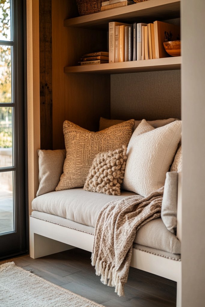 14. Cozy Reading Nook with Neutral Upholstery and Pillows