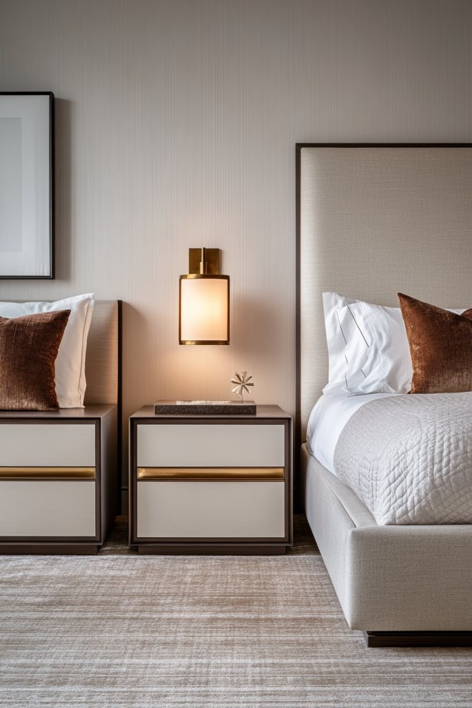 2. Minimalist Nightstands with Warm Metal Accents
