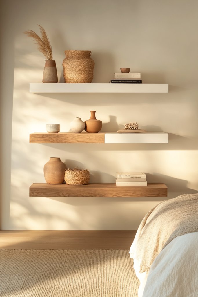 Use floating shelves in different sizes and arrangements to suit your space—vertical stacks for narrow walls or long, horizontal units for wider areas. Keep decor minimal—think textured boxes, ceramic bowls, or neatly stacked books in neutral tones. For seasonal updates, swap out decorative items or add small seasonal accents like candles or textiles. In small bedrooms, use floating shelves above nightstands or beds for extra storage without taking up space.
