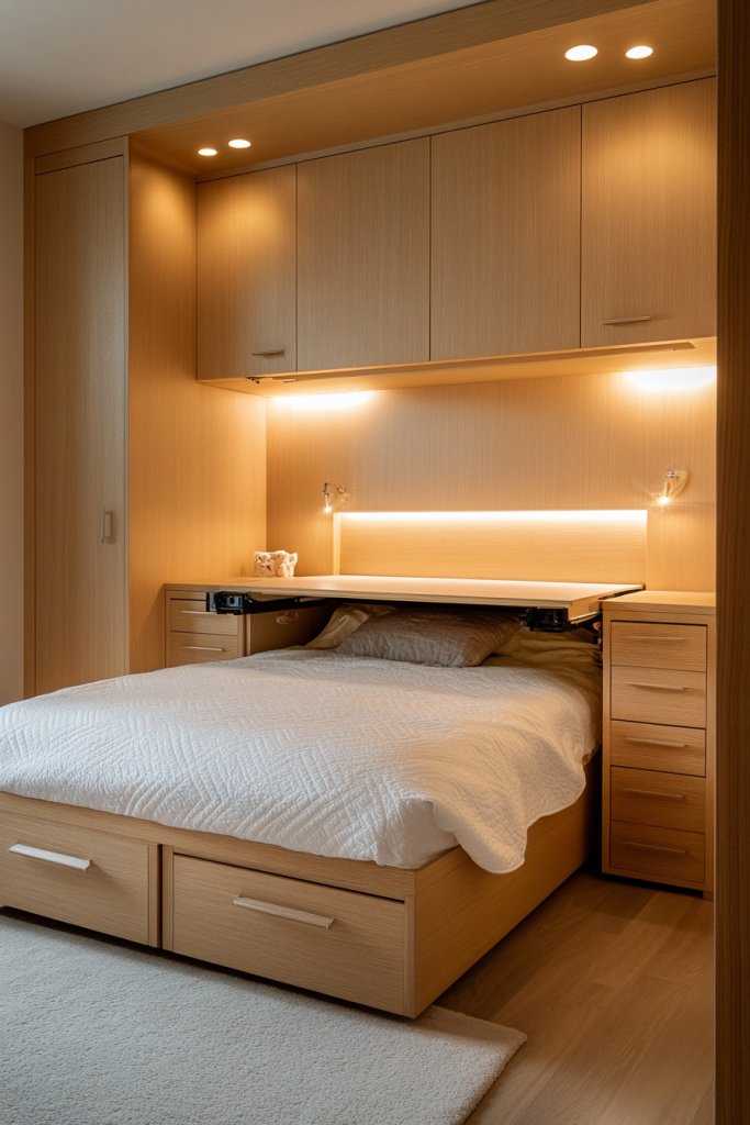 Choose multi-functional pieces that suit your needs—think beds with fold-out desks, storage ottomans, or fold-down wall tables. Use neutral tones and simple designs to keep the look modern and cohesive. In small bedrooms, opt for wall-mounted or fold-away options to maximize space. For larger rooms, incorporate statement multifunctional pieces that serve as focal points.