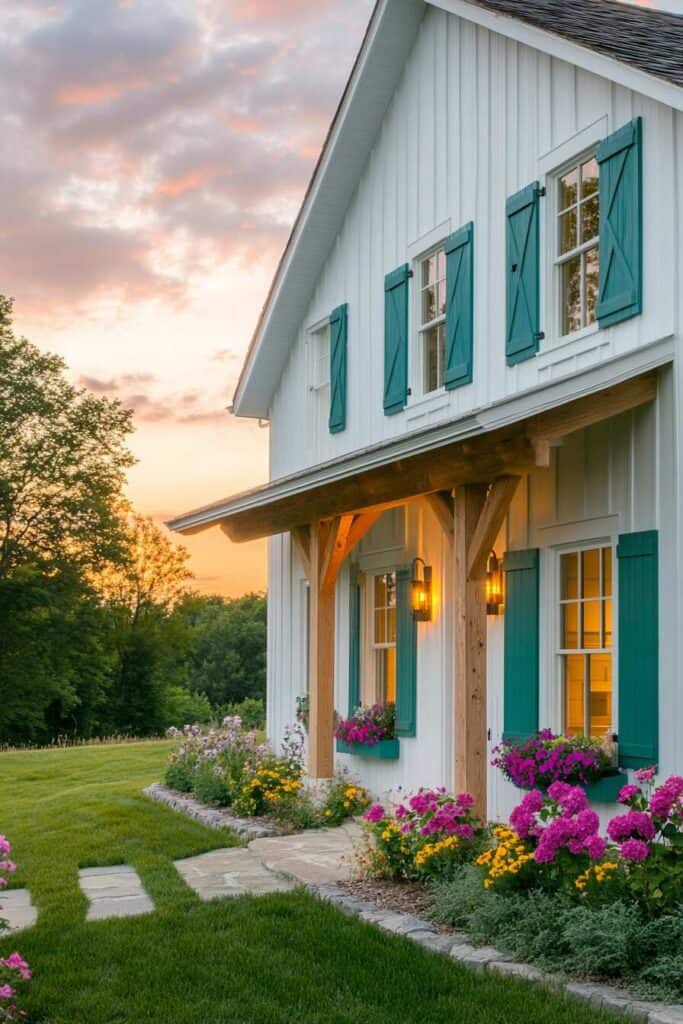 Ultimately, colorful shutters are not just functional; they’re an opportunity to showcase your creativity and enhance the inviting allure of your modern farmhouse.