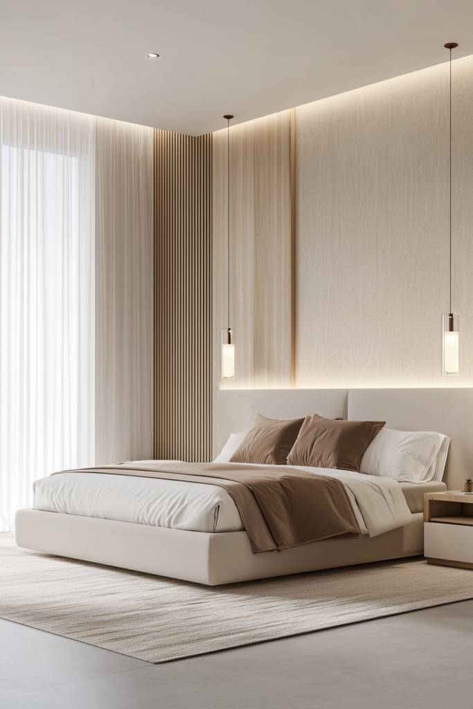 The clean lines, subtle wood paneling, and warm lighting create an inviting atmosphere perfect for relaxation. Hanging pendant lights add a touch of refinement, while the plush bedding enhances the comfort factor. A minimalist approach to decor allows the textures and materials to take center stage, making this bedroom a perfect retreat for those who appreciate understated luxury.