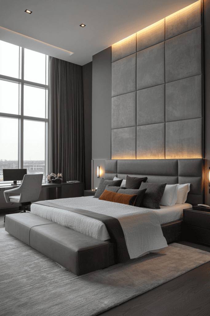 This ultra-modern bedroom embraces a dark, moody aesthetic with sleek, masculine energy. The oversized, padded gray headboard with integrated LED lighting adds a high-tech feel, while the deep gray color palette creates a cozy yet dramatic atmosphere. A streamlined desk area enhances functionality, making this space perfect for a stylish, contemporary bachelor pad or executive retreat.