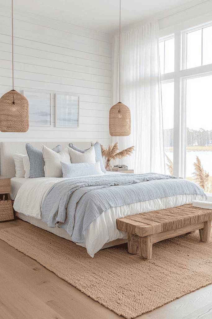 This airy coastal bedroom brings a refreshing, beachside vibe with its crisp white walls, light blue bedding, and natural woven textures. The rattan pendant lights and rustic wooden bench add warmth, while the oversized windows flood the space with natural light. The soft layering of pillows and throws enhances the relaxed luxury, making this bedroom perfect for those who love a serene and breezy ambiance.