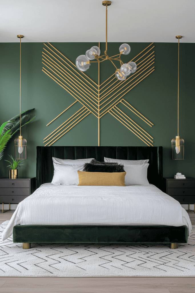 This bedroom exudes Art Deco sophistication with its emerald green velvet bed, gold geometric wall accents, and bold lighting fixtures. The symmetry and sharp, clean lines give the space an elevated feel, while touches of black add contrast and depth. Perfect for those who love a mix of vintage glamour and contemporary elegance, this space feels regal yet modern.