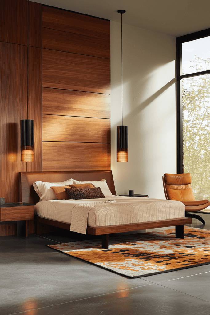 This bedroom embraces the rich, organic beauty of mid-century modern design. The warm wood-paneled accent wall, minimalist platform bed, and sleek leather chair create a cozy yet stylish retreat.